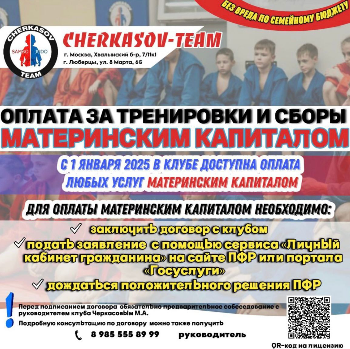 Перед подписанием договора обязательно предварительное собеседование с руководителем клуба Михаилом Анатольевичем Черкасовым. Подробную консультацию по договору можно также получить по телефону: +7 985 555 89 99 (руководитель)